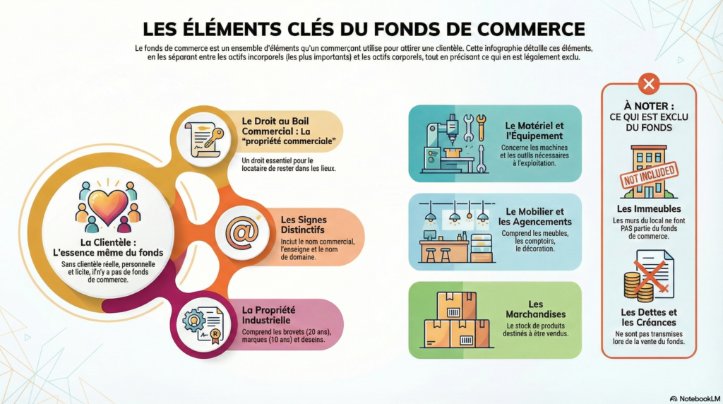 - Éléments incorporels (clientèle, nom commercial, bail commercial, PI)